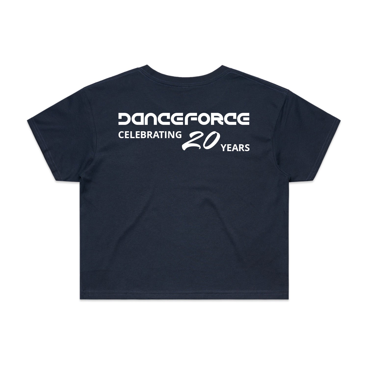 Dance Force celebrates 20 years with a limited number of cropped navy tees. Bringing back the Blue and White OG colours. The XS size was tried on students from 8 years - Adult Size 8 and it worked for all.